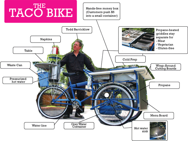 I have always been a proponent of bikes being far more useful than simply a vehicle from getting from point A to point B (though they are really good at that) and this is just another good example. A fellow reader of this blog sent me a link to this and it was just too cool not to post (thanks Max!). Like many cities, the one in which I live has a few street vendors and the latest is a taco truck…but there are no bicycle vendors that I am aware of…hmmm. At any rate, I think this is a pretty good idea…and the food looks good, too. To read more about the Taco bike click here, here, or here.