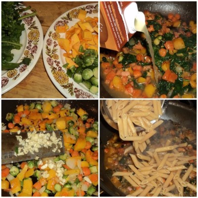 The title of this post and recipe is a play on words, or rather the name of the famous dish Pasta Primavera (click here for a recipe and the history of Pasta Primavera; click here to read about the chef who first created it). Why I say this is that the dish Pasta Primavera translates to English as “Pasta Springtime,” or springtime pasta, because of the inclusion of the spring vegetables that are naturally in the original recipe and undoubtedly the time of year that it was first created (I also find the origin of the word primavera interesting; broken into two separate words–prima and vera–it means “first green”). Pasta Autunno, on the other hand means–you guessed it–Pasta Autumn. Another variation (on the recipe itself, not it’s title) is that Primavera often contains cream and the vegetables may or may not be initially sauteed in butter. This version is really a variation of the classic aglio e olio, or garlic and oil. This is by far my favorite pasta preparation (OK, it’s a tough tie with traditional red sauce and meatballs) and it can be applied to almost any ingredient…in fact you don’t even need the pasta as a filler; using this recipe you can simply saute vegetables and serve them as a side dish. The basic recipe is this: heat good quality olive oil in a pan with garlic, hot peppers, and maybe a minced onion, cook it until it begins to brown, then add vegetables, a pinch of salt, and chicken broth (or water if you want to keep it vegetarian), and allow it to cook while you boil the pasta (inversley, if you have hard vegetables–such as those in this recipe–you may want to add them to the pan before the garlic, lest it burns). Cook the pasta al dente and add it to the skillet, allowing the pasta to finish cooking in the broth and absorb all the flavors. Many, but not all, of the vegetables I used in this recipe were in my fridge from the last fall harvest of the year (click here to see them). To read more on the actual process of cooking things algio e olio, and with more explicit photos, click here; if you’d like a tradition recipe (i.e. one that is printable), click here.