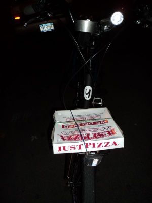 Hey Joe!What is that tube on your handlebar good for?I didn't notice that until I saw your foto today.A pizza on a bike! Isn't that "fast food"? 😉