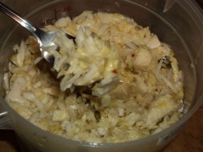 This post is a follow-up to one I wrote a couple weeks ago (click here to read the original). If you’re a reader of this blog you already know that I have a fascination with fermented foods (among other things), and sauerkraut is not only the most obvious of these but probably the most common. I’ve made sauerkraut many times before but what is unusual about this particular batch is that it was made with kraut that I grew myself…it went from the ground to the fermenting bucket within 30 minutes. Anyhow, and to cut-to-the chase…the current batch of sauerkraut (with hot peppers) is ready and geeze ‘o man is it delicious.