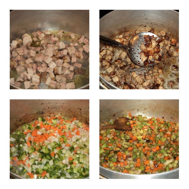 This is basically a variation on the classic recipe for Arroz con Carne de Puerco (Rice with Pork)…I decided to make it for an employee meal after I came upon some pork belly in the freezer that was left over from a party this past summer (and just a hint to the cook if you make this dish…while pork belly is delicious it is also very fatty, for that reason you cook it slowly at first to render much of the fat).