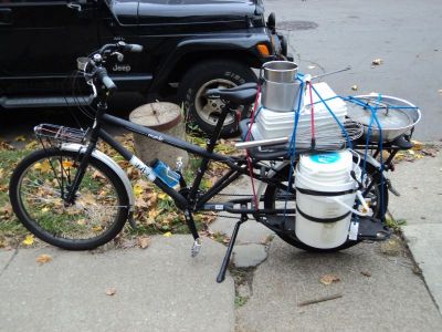 Pots, pans, over-sized wire whisks, bowls, plastic buckets, and other small pieces of cooking equipment. (The above photo is one of a trilogy where I catered a party and carried most of the equipment to-and-fro on my bike. To see other photos click here and here.)