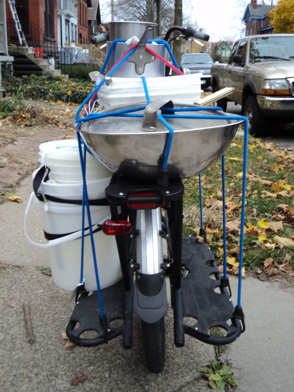Pots, pans, over-sized wire whisks, bowls, plastic buckets, and other small pieces of cooking equipment. (The above photo is one of a trilogy where I catered a party and carried most of the equipment to-and-fro on my bike. To see other photos click here and here.)