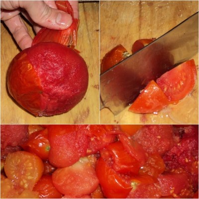 It may seem odd to be writing about tomatoes in mid-November but this is the outcome of a successful experiment. Last summer is a memory as I sit next to the wood-burning stove as I type, but it was sultry none-the-less. And the steamy heat brought not only multitude of tomatoes in my garden but also hordes of people to my place of work. Thus, because of the hectic summer I never made my usual summer’s-end batch of sauce, which I usually freeze and consume throughout the winter. In turn I froze the tomatoes whole as they ripened. I had never done this before but the outcome is excellent and I recommend it to others if you find yourself in a “time crises.” Anyhow, here’s the sauce in pictures.