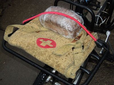 A canvas book bag containing, among other things, books, pens, mechanical pencils, and a day planner (and yes, you can see by the wetness of the bag that it was raining–my least favorite element to ride in–tomorrow it is supposed to be snow again).