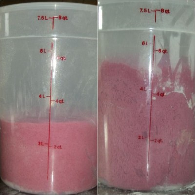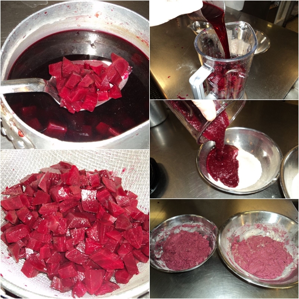 Boil the beets until very soft, allow them to cool to room temperature in the cooking liquid. Strain them, retaining the liquid. Measure some of the liquid with the beets and puree them. I used 100% whole wheat flour for this bread so I started the dough in two separate bowls (click here to see more explicit pictures on how to do this; click here for a recipe).