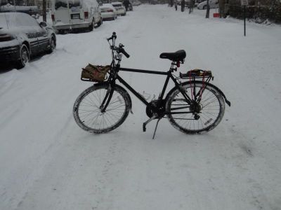Well the snow has finally hit and it seems a bit early this year, at least for this type of snow. This is actually the second heavy snow of the season. The most recent was just a few days ago which was classic lake effect. If you are not from this area of the world you may not be familiar with the term but lake effect snow hits suddenly and heavy, and often in distinct bands (the photo in the previous post was just taken yesterday and the pavement was dry). In lesser amounts this is sometimes called a snow squall. An area can be pelted with snow while a couple miles away it may be clear. This was the case the other day when the area just south of Buffalo received 3 feet of snow but the city center only had a few inches. The picture below is an aerial view of the snow coming in off Lake Erie last week. I personally have never seen this look so dramatic; most likely it was shot from an airplane. But you can see the intensity of it. Unfortunately I do not know the author of the picture to give credit where credit is due. I downloaded it from Facebook, where it was shared and copied, etc. We actually only received about 7 or 8 inches today but we are supposed to get more tonight. Our city has been famous for snow for more than a century apparently but it really made the spotlight during the never forgettable Blizzard of ’77. I was 16 at the time and had a blast (we could literally walk up a snow bank onto the roof of our house). At any rate, the snow made for a slow-go today on the bike. The picture above was when I arrived home from work. The snow was not too deep so it wasn’t too bad riding, but when the roads are not plowed I am more worried about the motorists than I am staying on my bike. So tonight when I went to the health club I actually drove my truck…I may be crazy but I’m not stupid. The roads should be better tomorrow.
