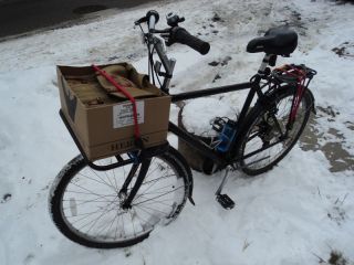A cardboard box containing two plastic containers; on contains a pint of Rice Pilaf with Orzo, the other a pint of Chicken a la King. A canvas bag containing a Kindle (containing 42 virtual books), two actual books, a day planner, and various writing implements.