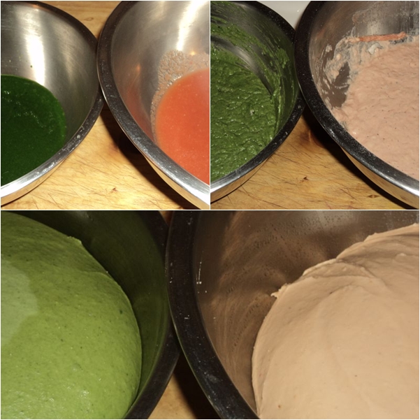 After the doughs have risen once or twice cut them into appropriate sizes and weights to fit your pans, then cut each in half again. Lay one piece of each separate dough on top of each other and roll them up.