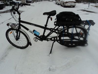 This has been a very odd winter in this region…the month of December was frigid and snowy, then it warmed up. Around new years it rained for three days and all the snow melted, and now it’s cold and snowy again. I’ve been riding the Mundo regularly again because of the lack of snow and when I woke to a blanket of new snow this morning I took it out to run a couple errands. Earlier in the day it was somewhat warm (32F/0C) so the snow was heavy. The Mundo handled well…with it’s heavy weight and low gear ratio (or is it high gear ratio? I always get that confused) I plowed right through it. Then this evening I had an appointment to keep and choose to ride my winter bike. I still have not purchased studded tires but that bike handles better in icy conditions (or maybe, because of it’s shorter wheel base and lighter weight it’s just easier for me to control). Anyhow, the snow that was heavy, wet, and slushy earlier in the day began to freeze by nightfall…the streets were a sheet of ice. I took mostly side streets to avoid traffic and went slowly. There were a couple points when I felt the bike slide a little underneath me (because of my own over-confidence), and it would bring me back to the reality that I was in motion on two wheels on ice. Other then those couple short rides today I had not left the house, nor did I seem to accomplish anything on my personal to-do list (one of those days), and as I slowly and precariously pedaled and coasted home tonight I couldn’t help but think how good it felt to be out in the open air on such a crisp winter’s night.