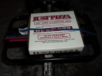 A Bike Rev trailer containing $82.57 worth of groceries and a gym bag full of wet clothes.