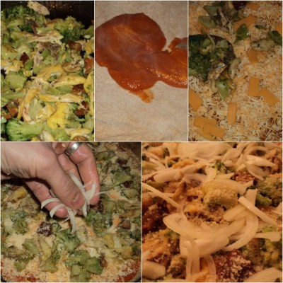 As is often the case when I’m home alone dinner is an afterthought…yesterday was one of these times. I am a firm believer that you can add almost anything to a soup pot, pasta, or top a pizza and it will be good and nourishing (within reason of course). Yesterday I was making bread so I thought I’d take a potion of the dough and make a pizza for dinner (which is not unlike me…click here for another example). Anyhow, after rummaging around my fridge, freezer, and pantry this is what I came up with: a cup or so of tomato sauce, a handful of frozen broccoli (from last summer’s garden), cooked chicken, a piece of kielbasa, an onion, three anchovies (yes, I like them), and (of course) cheese. So I peeled the skin from the chicken, rinsed the anchovies of their oil, chopped and diced everything, and sauteed it all in olive oil with hot peppers. After letting it cool a bit (don’t want to kill the live yeast in the dough by adding a scorching topping) I topped the pizza and baked it…delicious. You can make pizza out of almost anything…ate half of it and washed it down with cheap red wine while listening to NPR. My two pugs sat waiting and staring with their bugged out eyes for scrapes to drop–or me to throw them some–but I didn’t this time as I thought the anchovy/hot pepper combo may upset their stomachs. Satisfactory pizza could of course be made with store-bought dough, but it wouldn’t be nearly as fun or satisfying (in my opinion). If you need a recipe for whole wheat pizza/bread dough click here.