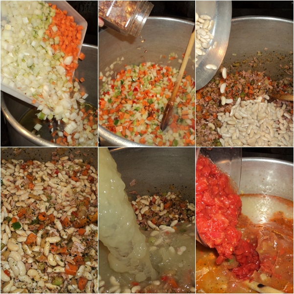 Pick through the beans for any stones or debris and place in a bowl with enough hot tap water to cover them. Allow the beans to soak for 1 hour, drain them and discard the soaking liquid. Heat the olive oil in a heavy bottomed pot and saute the pancetta over medium/high heat until it begins to caramelize (approximately 5 minutes). Add the onion, celery, carrots, and garlic, saute for 5 minutes. Stir in the crushed hot pepper, rosemary, salt, and black pepper, saute 2 minutes. Add the beans, tomatoes, and broth, bring to a simmer and allow to cook for 1 – 1 1/2 hours, or until the beans are very tender. If too much liquid evaporates, add more broth or water as needed.