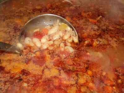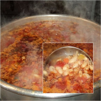 Pick through the beans for any stones or debris and place in a bowl with enough hot tap water to cover them. Allow the beans to soak for 1 hour, drain them and discard the soaking liquid. Heat the olive oil in a heavy bottomed pot and saute the pancetta over medium/high heat until it begins to caramelize (approximately 5 minutes). Add the onion, celery, carrots, and garlic, saute for 5 minutes. Stir in the crushed hot pepper, rosemary, salt, and black pepper, saute 2 minutes. Add the beans, tomatoes, and broth, bring to a simmer and allow to cook for 1 – 1 1/2 hours, or until the beans are very tender. If too much liquid evaporates, add more broth or water as needed.