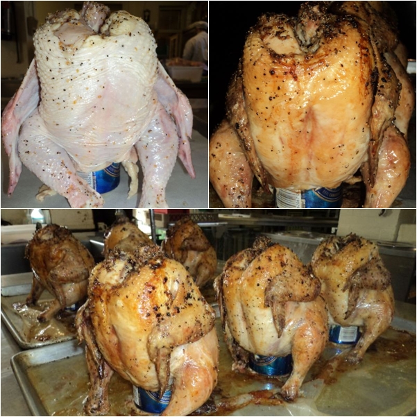 OK, first I have to admit that this is one of the weirdest recipes I’ve made…but the outcome is really delicious. The chicken meat is moist and the skin crisp…and it has a nice flavor also. It’s a recipe that was undoubtedly developed by some drunk guys at a backyard barbecue. The premise is this: take a full or partial can of beer and carefully “sit” the chicken on it. Place the chicken on a grill with a lid (making a sort of oven) and cook it over indirect heat until done; this also works well in a traditional oven, as these birds were cooked this morning. You can purchase wire racks to help hold the chicken vertical but they are not necessary; if you are careful the bird(s) stand by themselves. As the chicken cooks the beer boils in the can steaming it from the inside-out, and giving the bird a nice flavor. Simultaneously the bird roasts from the outside-in and the skin browns and becomes crisp. I made these for employee lunch today. Everyone seemed to love it; tomorrow leftover meat will be made into chicken salad. Not withstanding, and regardless of how good the chicken is, am I the only one that thinks there is something slightly obscene about this recipe? For a multitude of recipes and apparatus to cook this recipe, click here.