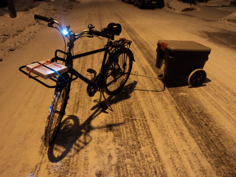 A very full BicycleR Evolution trailer containing nearly $100 worth of groceries, sundries, and other staples…and also two slices of pizza.