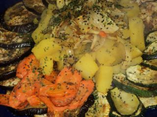Preheat an oven to 400 degrees Fahrenheit. Combine all of the ingredients in a medium bowl and toss to coat evenly. Heat a large non-stick skillet over high heat and add the vegetables. Sauté and toss the vegetables for 5 minutes, or until they begin to caramelize. Transfer the vegetables to a medium roasting pan and place in the oven. Roast the vegetables for about 25 minutes, or until browned and cooked throughout. Serve warm or room temperature.