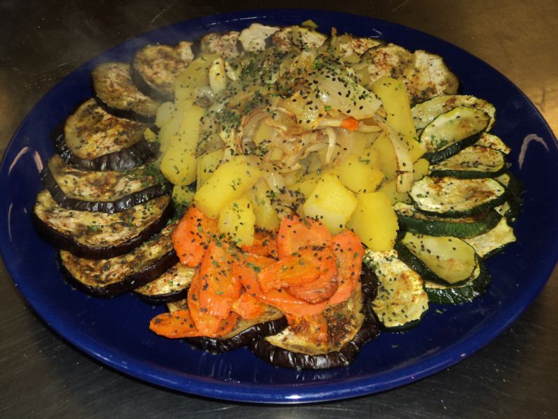 Preheat an oven to 400 degrees Fahrenheit. Combine all of the ingredients in a medium bowl and toss to coat evenly. Heat a large non-stick skillet over high heat and add the vegetables. Sauté and toss the vegetables for 5 minutes, or until they begin to caramelize. Transfer the vegetables to a medium roasting pan and place in the oven. Roast the vegetables for about 25 minutes, or until browned and cooked throughout. Serve warm or room temperature.