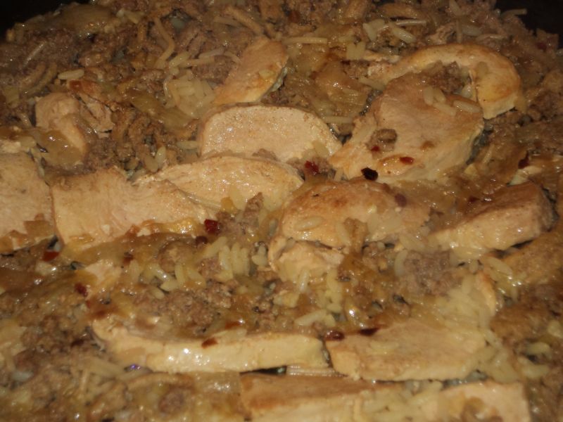 I’ve posted numerous times on Lebanese food in the past, mostly because I truly believe that it is one of the great cuisines of the world., but also it is a food that I grew up with; I am second-generation Lebanese-American…half actually, my father’s family was from “the old country.” Chicken-and-rice is my favorite recipe (from many cuisines) and I make variations of it often…and leftovers taste even better. Anyhow, this is another variation. The reason this is a variation is thrice-fold; firstly it is made with ground turkey (instead of lamb or beef), and I also used sliced boneless chicken breast (instead of bone-in chicken), plus I seasoned it with–in addition to the usual cinnamon, allspice, and cumin–turmeric and hot pepper. This recipe, then, is not the classic recipe, but it was really delicious none-the-less. If you’ve never had this dish I hope you try it because not only is it really, really delicious (did I mention how good it is?), but it will make your house smell delicious as it cooks…and it’s easy to make, too. Below is a basic recipe for it (using whole boneless chicken breasts), and if you’d like to read more about it (and my views on it’s correlation with the American processed food, Rice-a-Roni), see more pictures of it being made, or would like links to other Lebanese foods, click here.