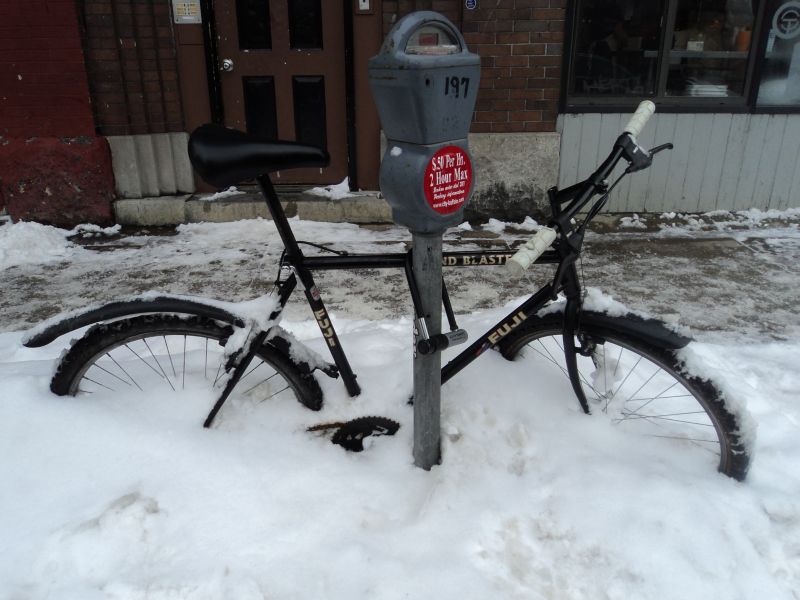 I pass the above apartment house on my way home from work and there are usually a few fixies locked to that or another parking meter. This one, which is also a fixed gear bike, at least has brakes and wide tires…it makes me cringe when I see people riding brakeless (sp?), skinny-tire bikes in the snow. And I’m still not sure why they lock their bikes outside 24/7…if it were me I’d bring it in my house…there’s always room; I keep mine parked in my living room.