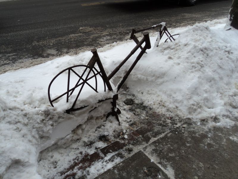 This is directly across the street in front of my favorite used book store…and to me this is the sign of a good neighbor. Not only do they have one-of-a-kind bicycle racks to lock your bike, they shovel them out of the snow.