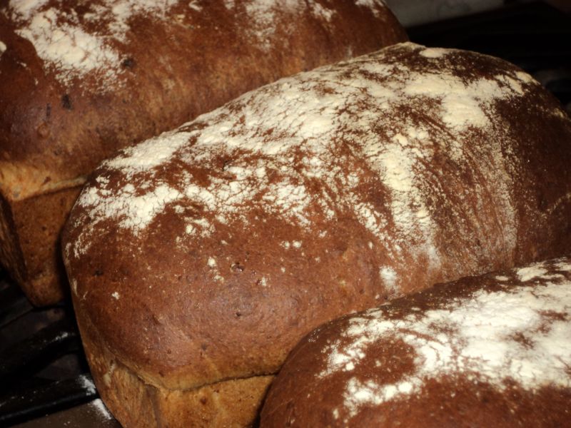Divide the dough into two pieces, shape it into loaves, and place it in lightly oiled loaf pans. Preheat an oven to 425F and allow the dough to ferment and rise for about 45 – 60 minutes. Bake the dough for about 30 minutes. When it is initially placed in the oven spritz the oven with a little water, lacking a sprayer toss a few ice cubes on the oven floor to create steam. Rotate the loaves after 15 minutes and spray the oven again. The bread is done when it is golden brown and sounds hollow when tapped with a finger. Remove it from the oven and their pans and transfer it to a wire cooling rack or clean towel which has been folded to double thickness. Allow the bread to cool 15 minutes before slicing.