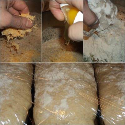 Combine the contents of bowls in the bowl of an upright mixer that is fitted with a dough hook. Also add the eggs, honey, olive oil, 3 teaspoons of yeast, and two teaspoons of kosher salt (try not to let the yeast and salt come into direct contact). Run the mixer first on low speed, until it gathers the ingredients together, then on medium speed; knead the dough for about 6 minutes. Add the cheese and knead the dough for another 1 or 2 minutes. Transfer the dough to a lightly oiled bowl or rising bucket, cover it and allow the dough to ferment for 60 – 90 minutes. Then gently press the dough down and allow it to ferment another 30 minutes.