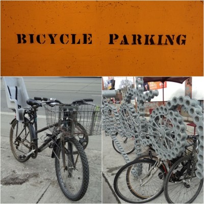 The top photo is a sign that greeted me as I drove my truck into the underground parking garage of my hotel (sometimes I bring my Dahon folder with me, but not this time). The photo on the left is a picture of a bike I saw parked on Bloor Street…it captured my attention because it looks like a bike that I would ride if my child were still young; a bike to carry everything you need and still plow through a bitter northern winter (an S.U.B., or a sport utility bicycle.). The pic on the right is a piece of artwork/bike rack made out of a giant bike chain that is at one of the entrances to the Kensington Market. But my favorite is the one below…Superman stopping a streetcar on Dundas and Yonge Streets, just to the left of Nathan Phillips Square.