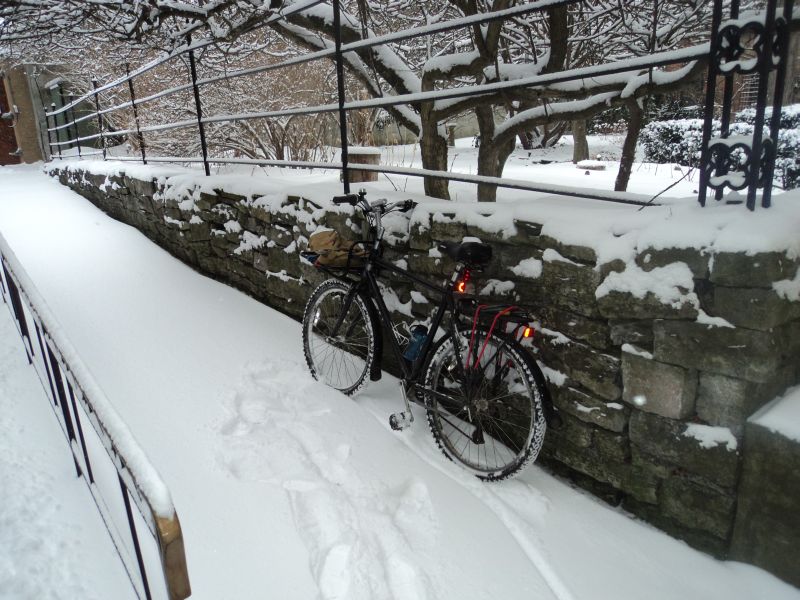 Here’s a picture as I arrived at work this morning. After last week’s thaw and the new blanket of pure white snow it looks more like the beginning of winter than the end. And being frigid cold again, I was glad–as I often am–that I only have a short ride in the morning.