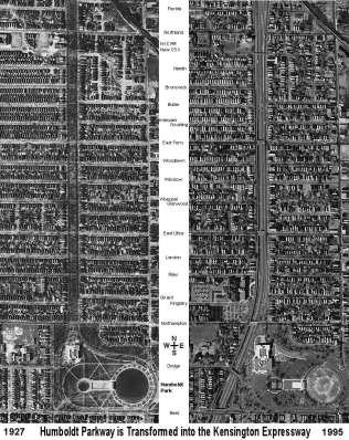 I came across this video this morning on Treehugger and it really struck a nerve with me. It’s in regards to highways cutting through cities: why we don’t need them and the destruction they leave in their wake. I’ve mentioned on numerous occasions that I am writing from Buffalo, NY…a small city, but it’s getting smaller (population) each year. It is quite literally half the size in population that it was 50 years ago. Anyhow, what struck a nerve in me–and to get to the point–is that like many American cities mine has a few hiways circumnenting them, but also one that cuts it directly in two. For a small city we have such beautiful park space…but it was once more beautiful. The park system was designed by Frederick Law Olmstead, who was most famous, I think, for designing Central Park in NYC (among numerous others). Anyhow, one of the parks–Humboldt Park–was shortened greatly by the Kensington Expressway. The park still remains, but the pan handle is gone.