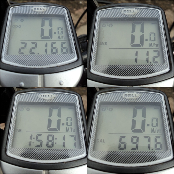 Anyhow…this brings me to my computer. Last summer I purchased this inexpensive wireless computer (odometer). I mounted it but before I programed it I missplaced the directions…thus I don’t belive I ever had it working correctly. But joy of joy the Internet is incredible (isn’t it?). After doing a few simple google searches I came upon this page that helped me out. Now it’s easy to see (counter clockwise, starting at upper left) that I traveled a little over 22 miles and it took me nearly 2 hours total travel time (not bad for a leisurely ride on a heavy seven ft. bike). I burned almost 700 calories and my average speed was 11mph/18kmh.