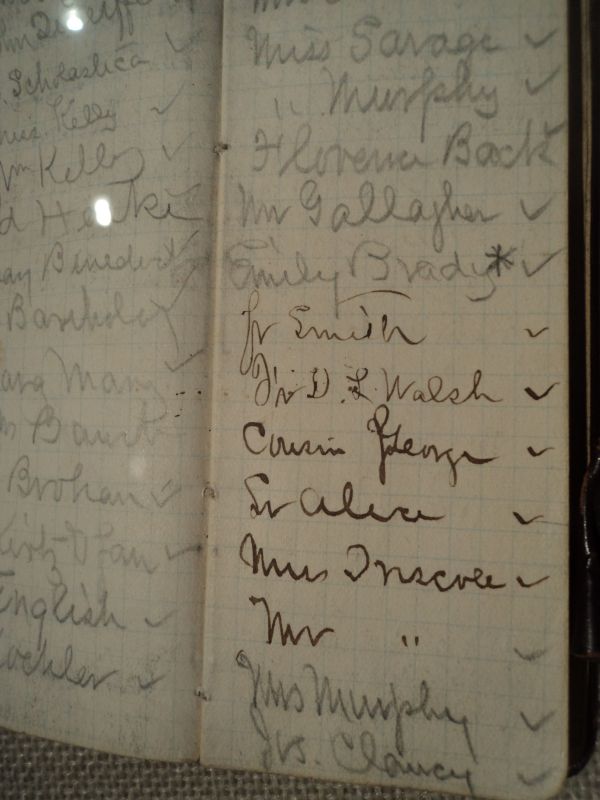 He was said to work tirelessly for others, both literally and spiritually. One of the things that he was said to do was pray for whoever asked….and apparently a lot of people asked. But still he never turned anyone down and prayed for each person by name whenever they asked. Because of the amount of requests he carried little leather notbooks with him and would write the names of the prayer requests in them and check them off as he prayed for them. The above image is one I took in the museum; it’s one of many of his little prayer books that were on display but this one was the only one open. What immediatly caught my attention when I looked at the book–and the reason I took the photo–is the name that is sixth from the bottom…the surname looks to me to be George (my last name), but I can’t make out the first name. The George side of my family came to the USA in 1920 (I believe) and has lived in the Buffalo area ever since…I can only wonder if Father Baker (who passed away in 1936) personally prayed for one of my direct ancestors (there’s not a lot of Georges in the area).