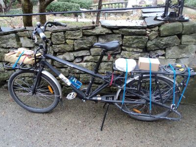 A canvas bag containing, among other things, a few actual books and nearly 60 virtual books. Two ham-and-cheese panini. Two pounds of sliced turkey. A small cardboard box containing new headphones (for my son). A six foot cable lock.