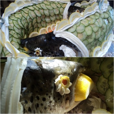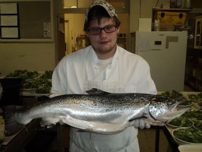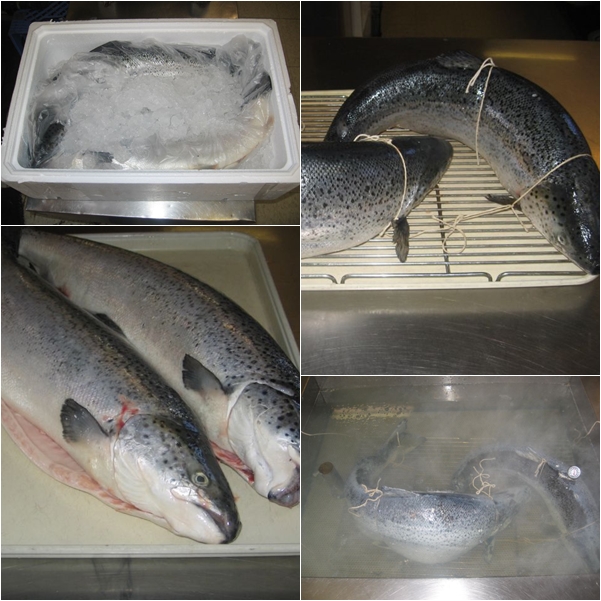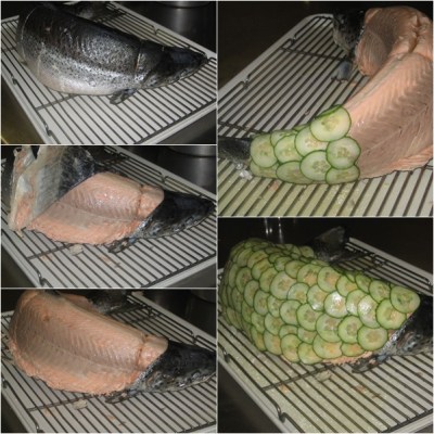OK, firstly…there’s nothing really urban simple about this post other than it falls under the category of cooking, and that it is part of my work so I suppose it is also part of the sacred journey of my everyday life (though it doesn’t always seem that way when I’m stressing out at work). Anyhow, as I’ve mentioned before I work in a private city club, and in envioromets like this a cook is able to make things–classical things–that he/she may not otherwise have the opportumity to (in a public restaurant)…this is one such dish. It is a variation on the classic French dish chaud froid, or hot-cold, making reference to the fact that it was prepared hot and then served cold (to read more about chaud froid, click here). It can be done with most meats, fish or poultry; in this case I used salmon. Whichever protein you use it is usually coated in an aspic, or a sauce that has had gelatin added to it. In the instance of this recipe–after poaching the fish whole, chilling them, and removing their skin and fins–I also dipped thinly sliced cucumbers in aspic and applied them to the fish to make them a sort of pseudo edible scale. It’s also garnished with minced vegetables and whipped seasoned cream cheese. Sounds odd…maybe, but if you enjoy fish this is surely delicious. Anyhow, here’s how I made it. (The bottom photo is Steve–one of our cooks–holding a fish so you can get a perspective of how big the fish are)
