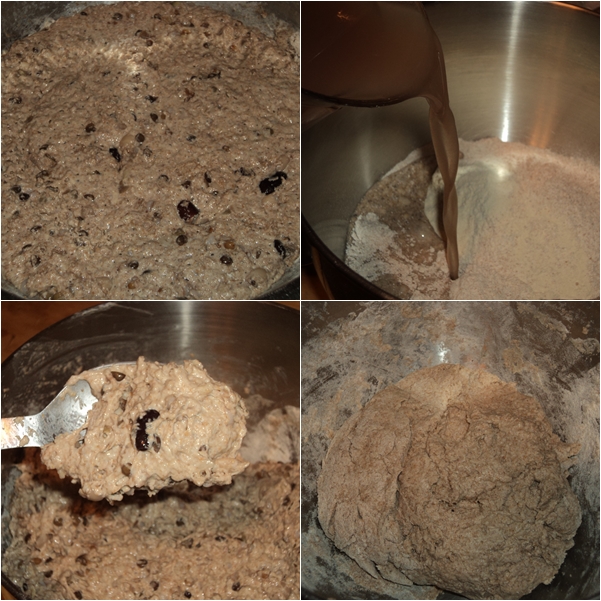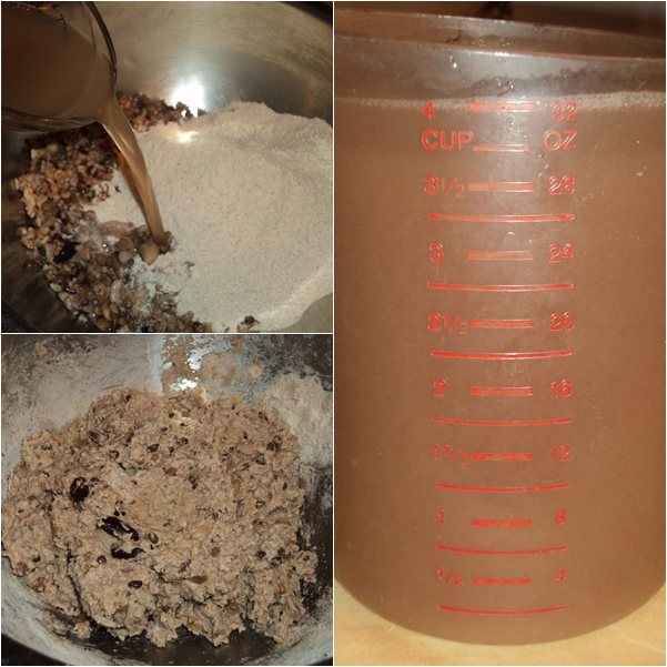 Start by boiling the grains in logical succession to insure that they are thoroughly cooked without completely dissolving. If too much water evaporates add more to the pot (you’ll need some of the cooking liquid for the bread recipe. by using the cooking liquid you are utilizing nutrients that may have been leached out of the grains during their cooking).
