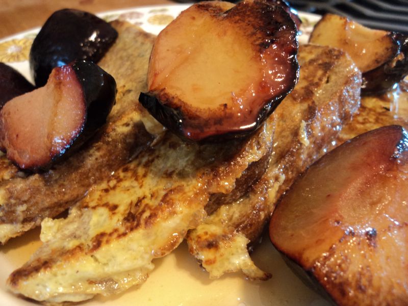 Soak good quality bread in a mixture of eggs and milk (I used homemade Ezekiel Bread, but store-bought would be fine as well). Meanwhile simmer fruit juice in a pan with a splash of honey, maple syrup, or sugar (use whatever is your favorite juice). While the juice simmers to a syrup constancy heat a skillet with canola oil or butter, or a combination of both. Add the soaked bread to the pan along with whatever fruit you have on hand or would like to eat. By the time the bread and fruit are caramelized and cooked throughout the syrup should be ready. Why pay $7.00 a plate for this when you can make it at home for a fraction of the cost in about 10 minutes. And it is as good as it looks.