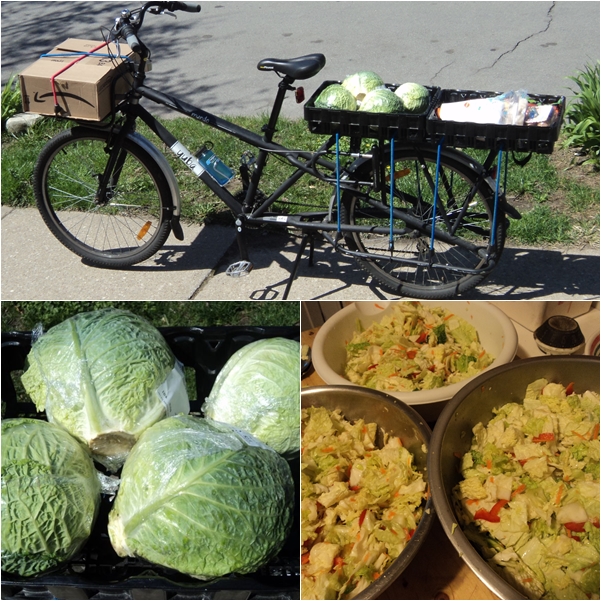 Two plastic soda crates and a cardboard box containing $52.64 in groceries, which include ingredients for a fresh batch of kim chi (click here to learn more about kim chi and naturally fermented foods).