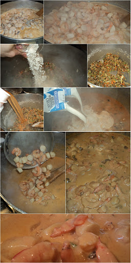 This (the pictures) is a variation on the classic lobster dish by the same name (click here or here to read about it). While this may seem extravagant (and it certainly is) and rich (which it is also), it is exceedingly simple to prepare. It’s a recipe you may want to serve for special occasions. I made about 15 gallons of it for a Mother’s Day brunch I’ll be serving this weekend…the recipe below is in much more manageable proportions. Use the recipe as a guide; substitute whichever shellfish you’d like.