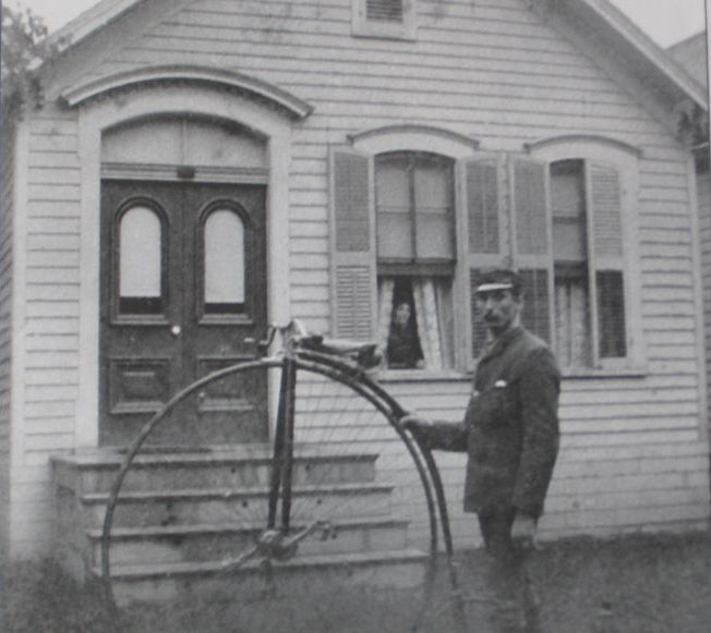 Well, first of all, the man in the picture is Fred Tornow and he is standing in front of my house with a Penny-Farthing bicycle in 1886. No…sorry, let me start over. He is standing in front of his house in 1886. The best I can figure is he was the second owner of the house (I’m something like the 9th) and he and his wife (the woman in the window, I presume) lived here for more than 40 years; don’t know if they had children but I assume so.