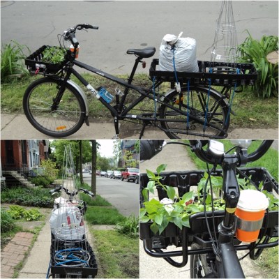 Twenty small vegetable plants, forty pounds of top soil, four tomato cages, six extra bungee cords, and a twelve-ounce cup of coffee.