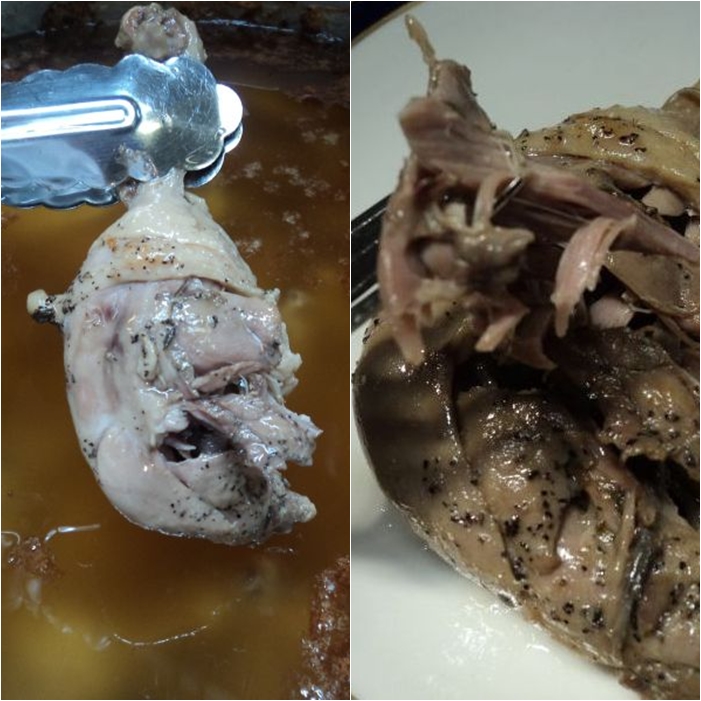 Anyhow, the recipe goes like this: salt the duck, add herbs (usually fresh thyme, and layer it in a pan with onions and garlic between a few sheets of clean cloth (to absorb juices). After a couple (or a few) days, remove the duck and brush off the onions and herbs. Then (and this may sound odd to the uninitiated), poach it in rendered fat for hours…until the meat falls from the bone. And the best fat to use is it’s own, but in the event you don’t have rendered duck fat you can also use chicken fat (shmaltz), or in a pinch, vegetable oil. I used a combination of duck fat, chicken fat, and a small amount of bacon fat for extra flavor.