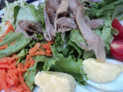 To lighten it up a bit I served the meat removed from the bone, warmed, and atop a salad (with potato, hard cooked egg, and a variety of shredded vegetables). Paired with an orange vinaigrette it is a contemporary play on the classic Canard à l’Orange.