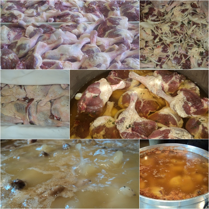 I haven’t made duck conft in quite a while but it was on the menu of a somewhat large luncheon I served a few days ago so I made it in a large scale (96 duck legs). The recipe’s title, confit de canard, translates from the French simply as preserved duck…and that’s what it originally was. It’s preparation is quite simple but may seem complicated at first because of the amount of time it takes…2-4 days, depending on how long you let the duck cure before you cook it. But the amount of actual time you spend preparing it is minimal…like most truly good foods, this one almost prepares itself, you simply guide it along.