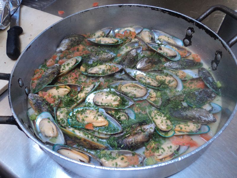 Place all of the ingredients except the parsley in a low-sided pot or a very large skillet. Cover the pan and place it over a fast flame. Cook the mussels, shaking the pan occasionally, until they open, then cook for an additional minute. Remove from the heat and sprinkle the parsley across the mussels.