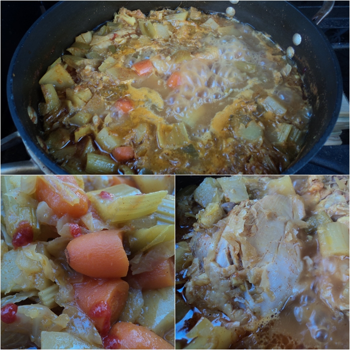 It was about 4pm yesterday and I had been working hard most of the day in my garden and other things in the sun. I was getting hungry and didn’t want to stop working but also didn’t want to order takeout…I wanted real food. So I checked my pantry and fridge and found some vegetables and chicken legs. I put them in a pot with a few cloves of crushed garlic, a tablespoon each of curry and tandoori spice, a pinch of kosher salt, and enough chicken broth to cover everything. Not wanting to heat up my kitchen I took the pot outside and brought it to a boil on my outdoor stove. This way I could keep an eye on it as I continued to work. I lowered the pot to a simmer and after about an hour the meat was falling from the bone and the potatoes began to thicken the broth. I could have sauteed the vegetable or sweated them first, but that wold have complicated things…I still had dirt on my hands and sawdust in my hair (what remains of it) and wanted to spend a mere 5 minutes in prep time; just enough time to gather the ingredients and put them in a pot. Just before I removed the pot from the heat I stirred in a little lemon juice to brighten it a bit.