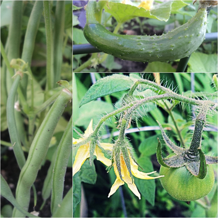 I was pleasantly surprised when I went to the garden tonight to snap a few photos. It was the evening and the sun hits the plants “just right.” Because of my late start this year I did not expect any flowers or fruit yet, but upon closer inspection there is plenty. I ate beans as I lifted leaves and snapped the photos (and yes they are nice and sweet). But it’s the tomatoes–my favorite–that I am really waiting for.