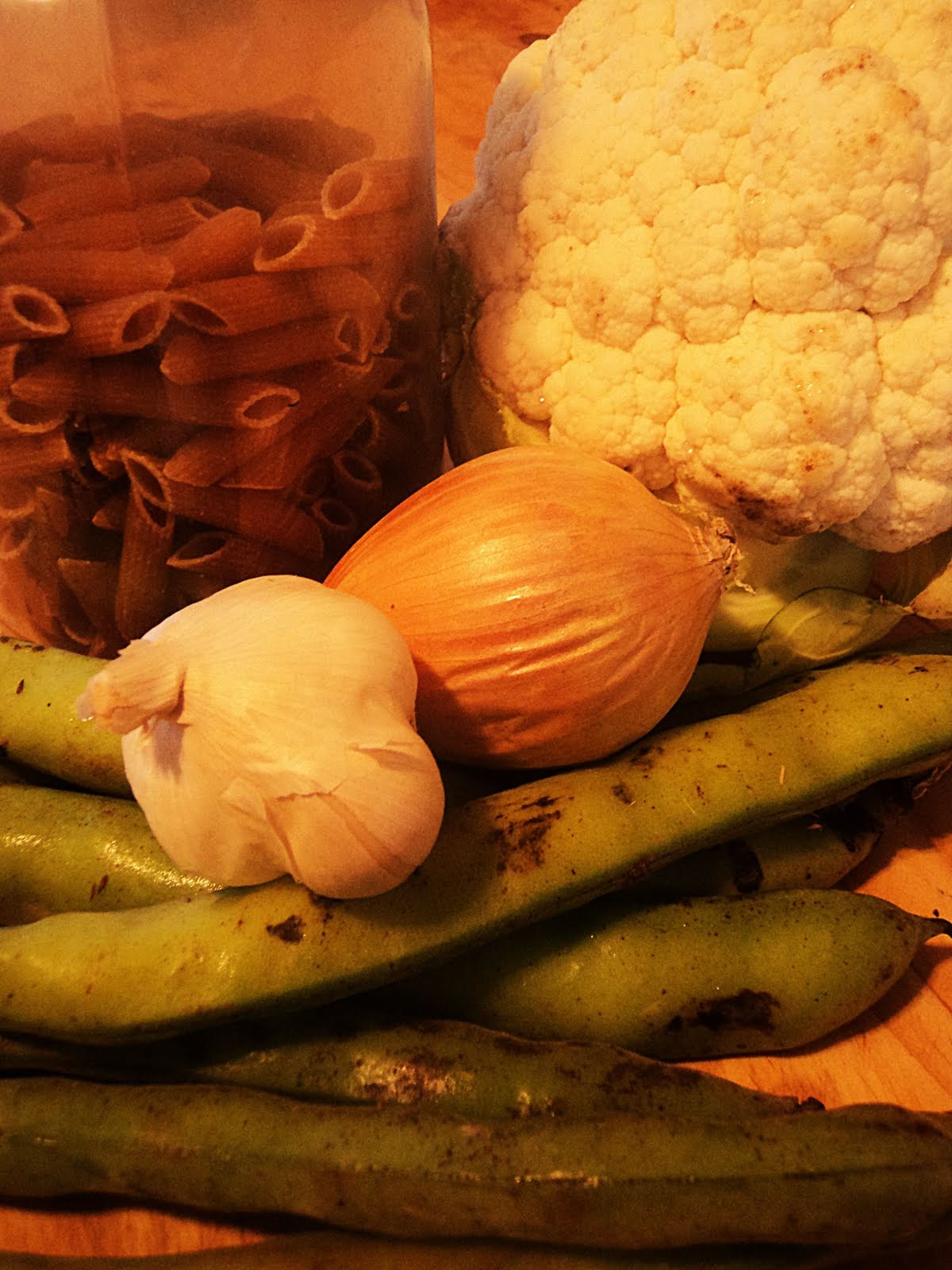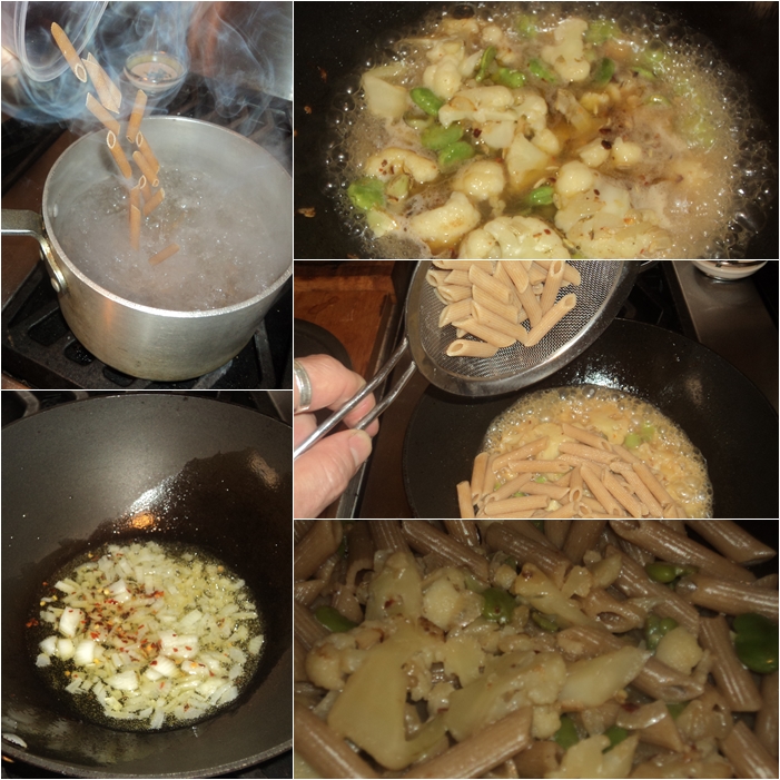 I really believe I can–and have–eaten nearly any vegetable cooked in olive oil and garlic (and chicken broth) and tossed with pasta. This is one of my favorite comfort foods. Below is the classic recipe with broccoli, but tonight I made it with fresh fava beans, caramelized cauliflower, and whole grain penne; I also added a few fennel seeds. Use the basic recipe below and adapt it to whatever you like. It’s fast, easy, nutritious, and super flavorful. Click here to see other variations of this same dish (which includes better photos and informative directions). Click here to go home.