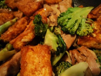 Stir in the chicken broth; bring it to a boil, then stir in the soy-cornstarch mixture. Bring it to a simmer, then add the broccoli and bean curd. Stir and toss it to evenly coat it with sauce. Continue to heat the pan just until the broccoli is heated throughout.