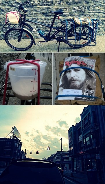 Things On The Bike: A plastic bucket with raw bread dough, a canvas book bag containing various things (including–oddly–a couple tulip bulbs), and a Rolling Stone magazine.