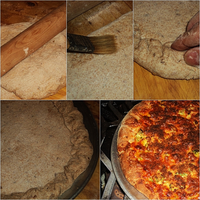 Pizza is one of my favorite homemade comfort foods to make (click here for additional pictures and recipes). And while many believe it to be time-consuming and somewhat laborious–or even difficult–to make, it is neither. It’s basically bread dough with stuff baked on it. Thus, when I bake pizza at home I usually make twice the amount of dough as needed and use half to make a loaf of bread…it rises and ferments while the pizza is baking. Over the years I’ve gravitated to baking almost exclusively with whole grains and whole wheat flour and this is no exception. What’s a bit different about this particular recipe is that I made it a deep-dish pizza, meaning I made a sort of rim around the edge to hold even more stuff (mmm…). And in this night’s variety I used broccoli, which I par-cooked and chopped before adding it to the pizza, homemade tomato sauce, made with some of the last tomatoes from the garden (click here for a recipe), and a 3-cheese blend I had in the freezer.